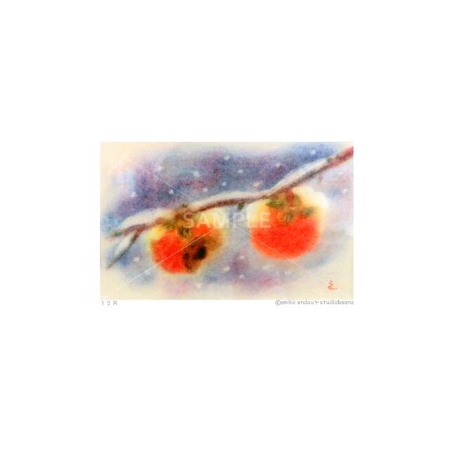 検索用ワード★ 果物 柿 かき 雪 冬 ポストカード パステル パステルカラー