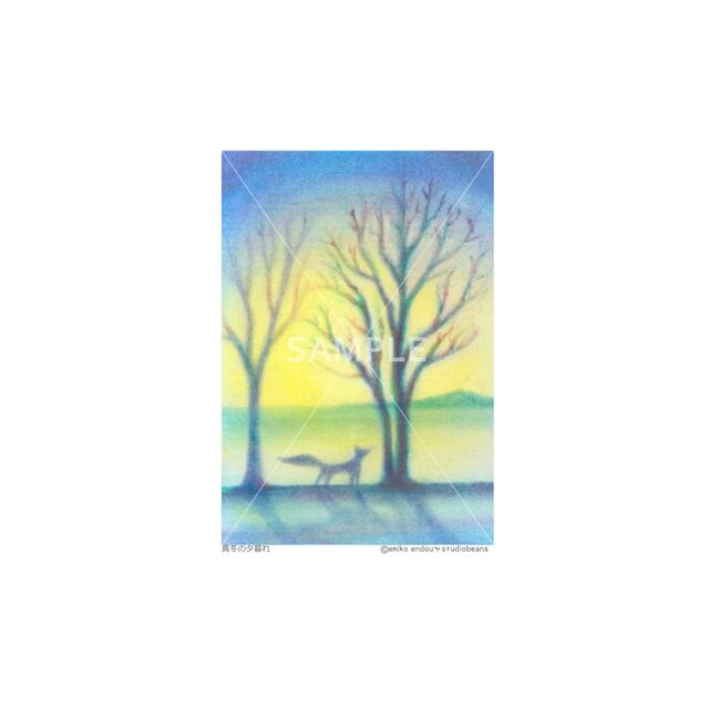 検索用ワード★ 雪 冬 ポストカード パステル パステルカラー 自然 夕暮れ きつね キツネ 狐 木